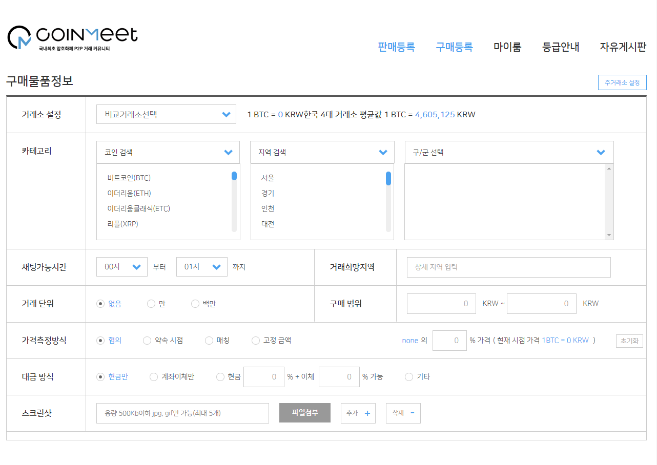 코인을 찾고 지역 및 채팅 시간, 거래 가능시간, 비교거래소 입력 후 하단의 등록을 하면 거래등록이 되고