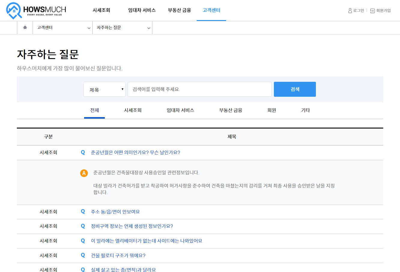 상단의 전체, 아파트, 빌라, 오피스텔, 지번 으로 검색 분류가 가능합니다.