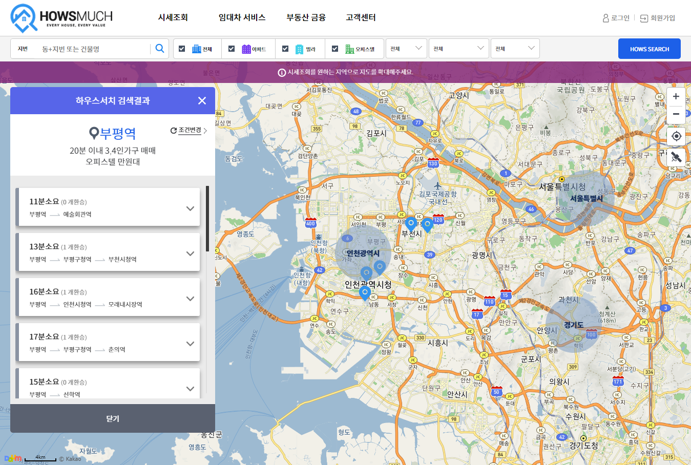 지도페이지에서 우측 하우스서치버튼 클릭후 역,원하는매물에 대한 특징 입력후 서치할시,