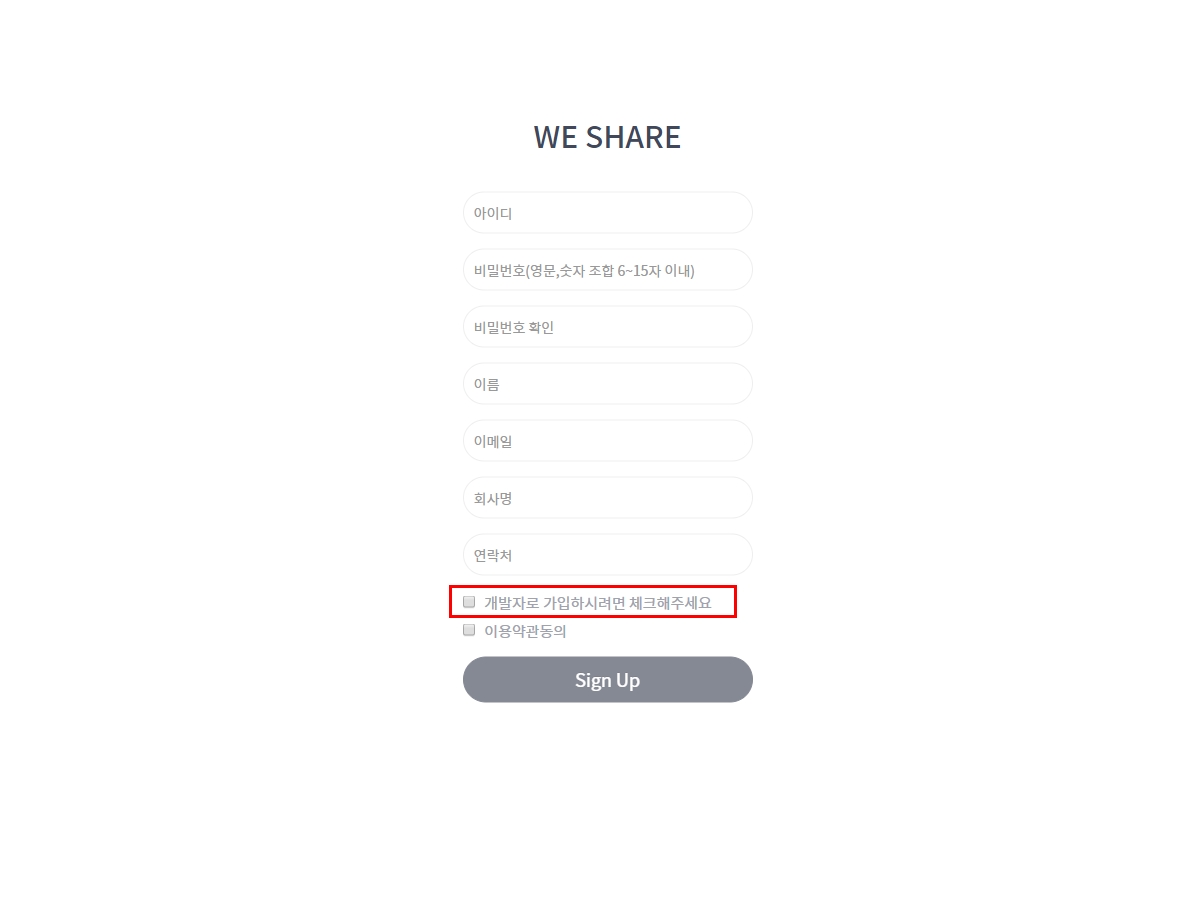 회원가입 페이지입니다. APP 등록을 하게될 유저일경우 개발자로 가입해야합니다.