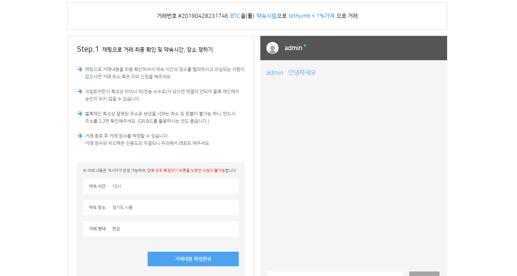 해당페이지에서 시간, 약속장소, 거래형태를 확정 짓고, 채팅으로 대화 후 OTC 거래 완료 후에 하단의 거래 완료를 클릭하시면
