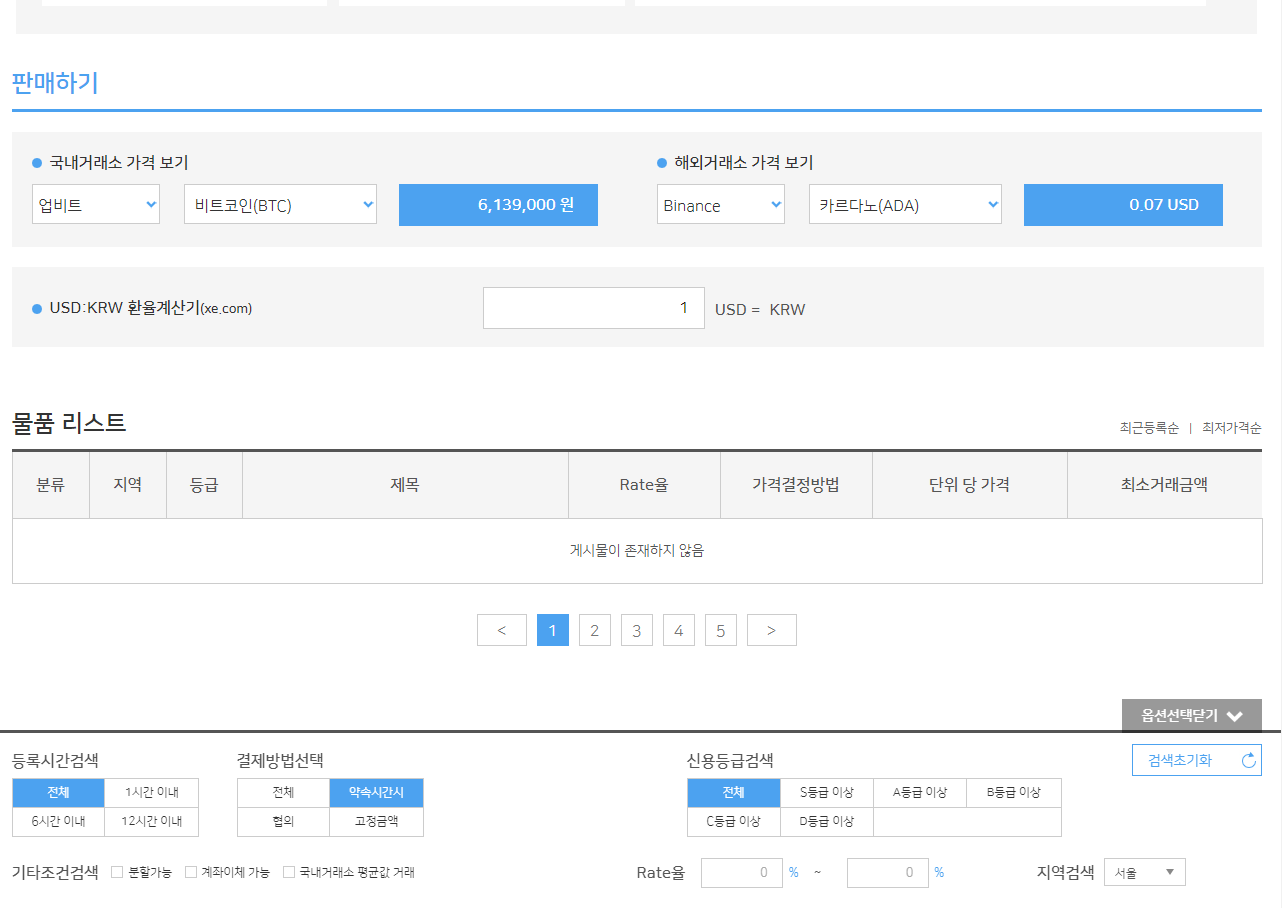 코인을 찾고 지역 및 채팅 시간, 거래 가능시간, 비교거래소 입력 후 하단의 등록을 하면 거래등록이 되고