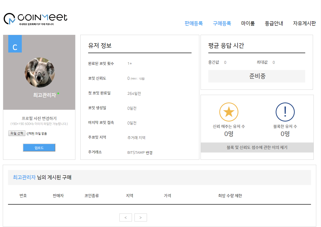 마이페이지입니다. 자신이 등록한 구매 판매 거래 및 완료된, 진행중인 내역을 볼 수 있으며, 프로필 사진 및 닉네임을 정할 수 있고, 주 거래지역 및 주 거래소 선택이 가능합니다.